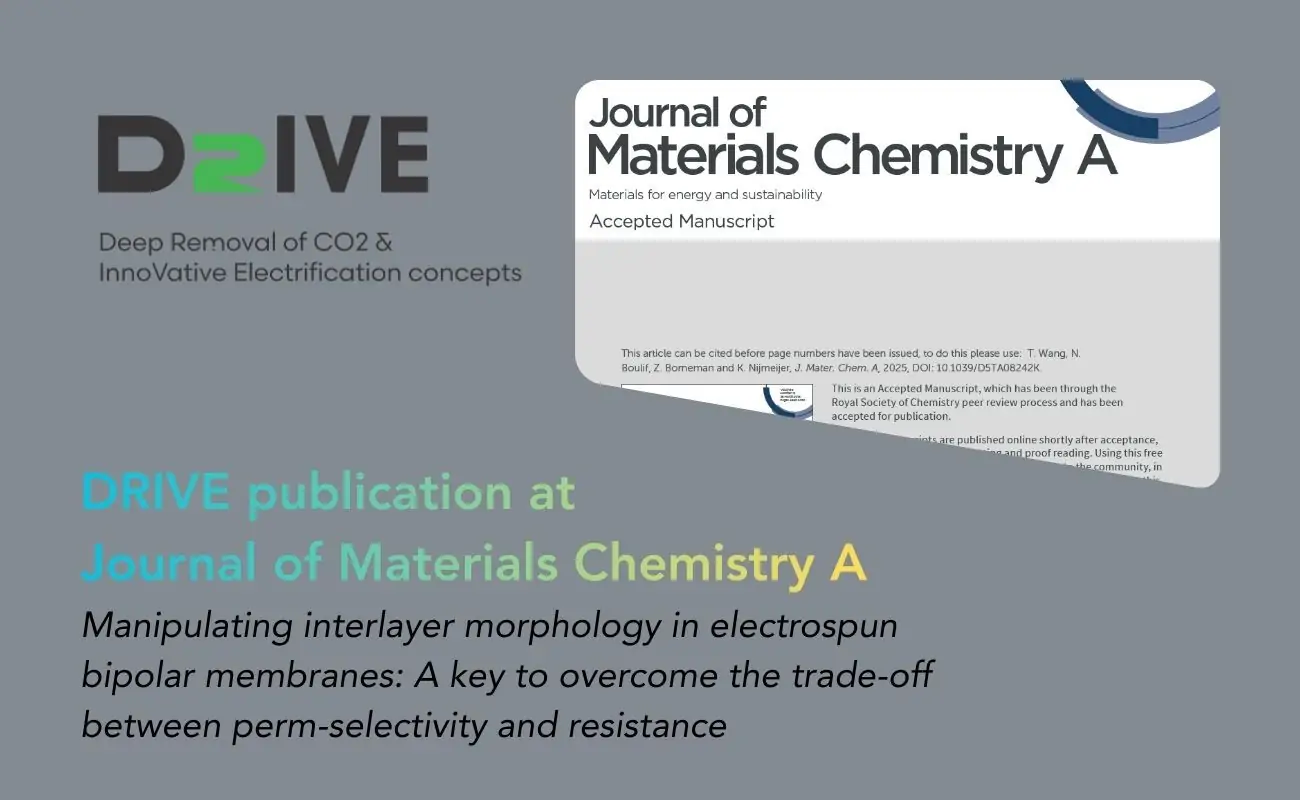 A new scientific publication from the Membrane Materials & Processes group at Eindhoven University of Technology (TU/e), a key scientific partner in the DRIVE project, presents a breakthrough in the field of bipolar membranes (BPMs). Published in the Journal of Materials Chemistry A, the study “Manipulating interlayer morphology in electrospun bipolar membranes: A key to overcome the trade-off between perm-selectivity and resistance” (Wang et al., 2025) demonstrates, for the first time, a viable pathway to simultaneously achieve low membrane resistance and high perm-selectivity.